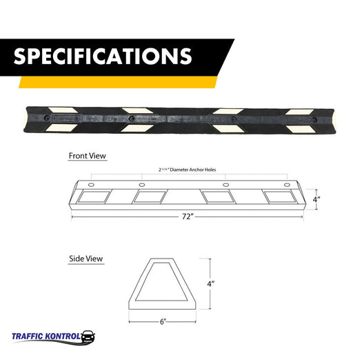 6 Foot Long - Rubber Parking Curb Wheel Stop Block With Spikes - Yellow Features: 72" Long x 6" Wide x 4" Tall 29 lbs each 12" Inch Long Installat...