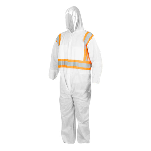 Forcefield® White Disposable SMS Coverall with Hood and Reflective Tape - SMSHV